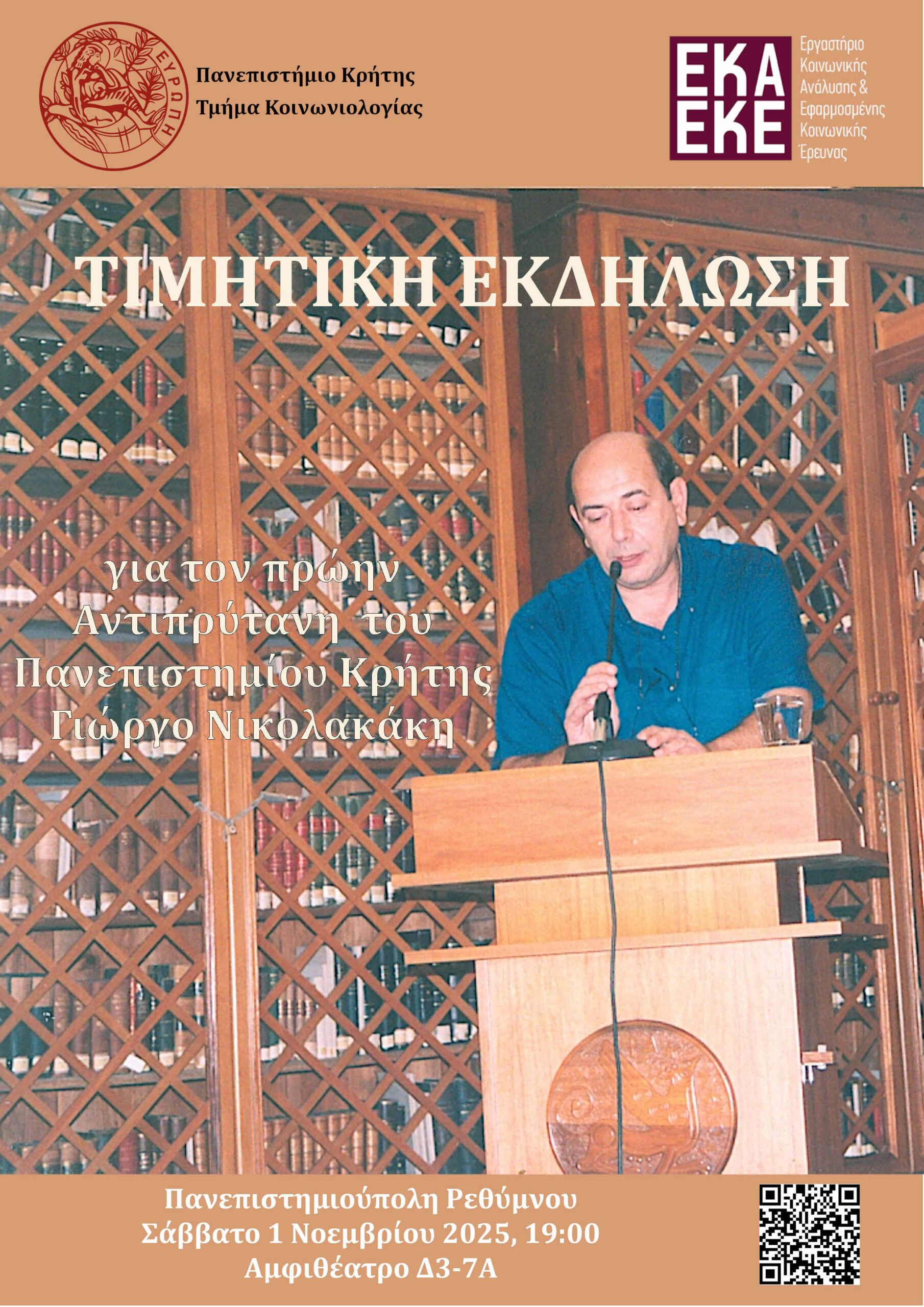 Για το έργο του τιμώμενου θα μιλήσει ο καθηγητής του Τμήματος Κοινωνιολογίας Γιάννης Ζαϊμάκης
