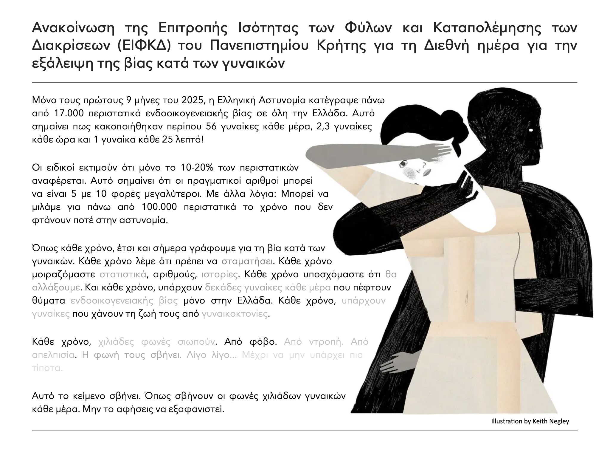 Ανακοίνωση της Επιτροπής Ισότητας των Φύλων και Καταπολέμησης των Διακρίσεων (ΕΙΦΚΔ) του Πανεπιστημίου Κρήτης για τη Διεθνή ημέρα για την εξάλειψη της βίας κατά των γυναικών.