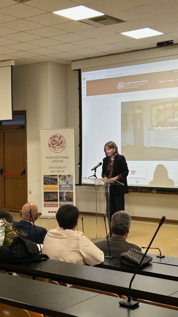 Η εκδήλωση ολοκληρώθηκε με την ομιλία της τιμώμενης, η οποία αφού ευχαρίστησε τους συναδέλφους της στο Πανεπιστήμιο Κρήτης και τη Διοίκηση του Ιδρύματος για την ιδιαίτερη τιμή που της επιφύλαξαν με την ομοτιμοποίηση της, αναφέρθηκε στην πορεία και τις προκλήσεις που σημάδεψαν την ακαδημαϊκή της διαδρομή. Στην ομιλία της η κα Κούση Λεκάκη αναφέρθηκε στις ηθικές διαστάσεις του φλέγοντος ζητήματος της Τεχνητής Νοημοσύνης και την ανάγκη της κριτικής ανάλυσης των τεχνολογικών εξελίξεων. Χρησιμοποιώντας ως παράδειγμα την αλληλεπίδραση μεταξύ κοινωνικών κινημάτων και τεχνητής νοημοσύνης, κατέδειξε το επίκαιρο και τη σημαντικότητα της διερεύνησης των σχετικών προκλήσεων, υπό το θεωρητικό πρίσμα και τα μεθοδολογικά εργαλεία της επιστήμης της κοινωνιολογίας.