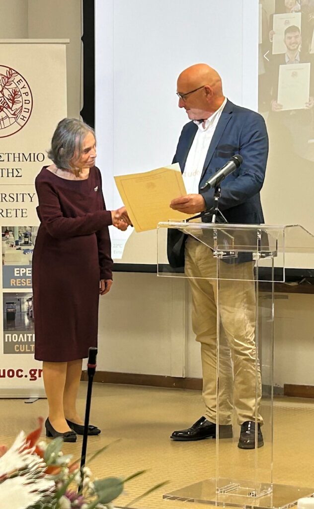 Ακολούθησε η ανάγνωση του τιμητικού διπλώματος από την Πρόεδρο του Τμήματος Καθηγήτρια Χρ. Καρακιουλάφη και η απονομή του από τον Πρύτανη Καθηγητή Γ. Κοντάκη.